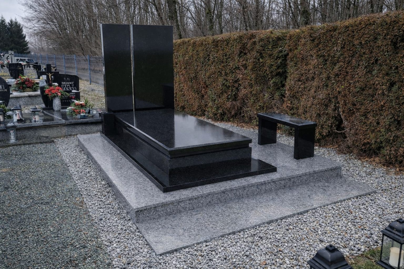 Oferujemy galanterię nagrobną: wazony, lampiony i dodatki, stanowiące spójne uzupełnienie nagrobka.