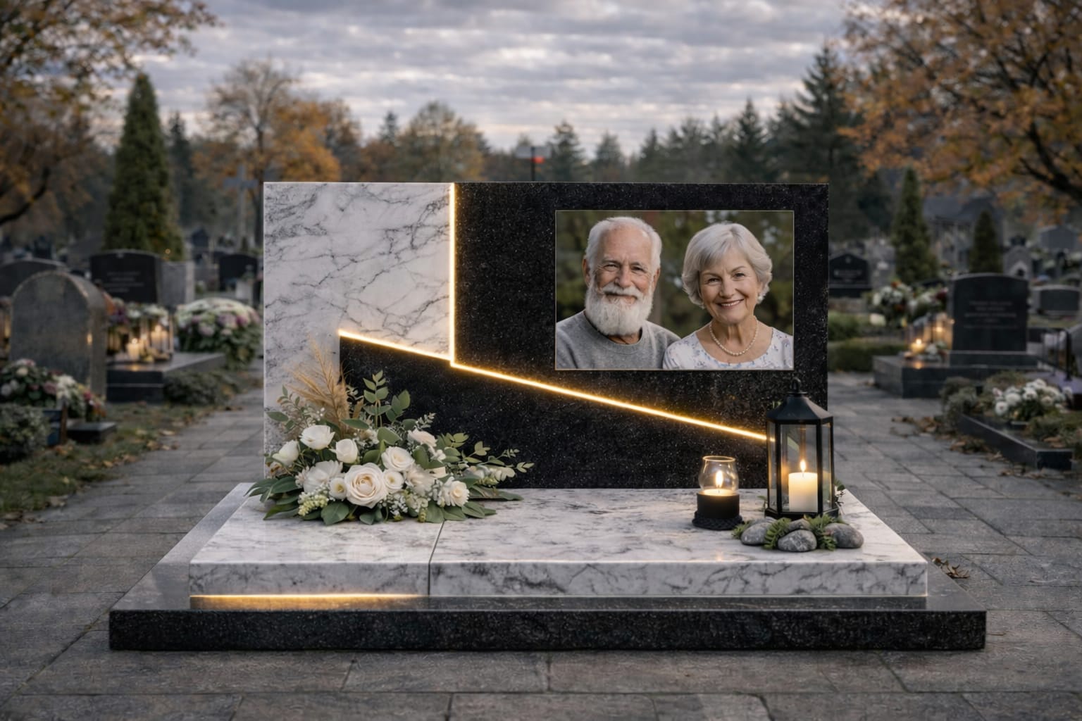 Nagrobek podwójny to konstrukcja o większych wymiarach, która wymaga odpowiedniego rozplanowania każdego elementu – od szerokości płyty, przez wysokość części napisowej, aż po detale wykończenia. Kluczowe znaczenie ma zachowanie symetrii oraz proporcji, tak aby całość prezentowała się estetycznie i harmonijnie.